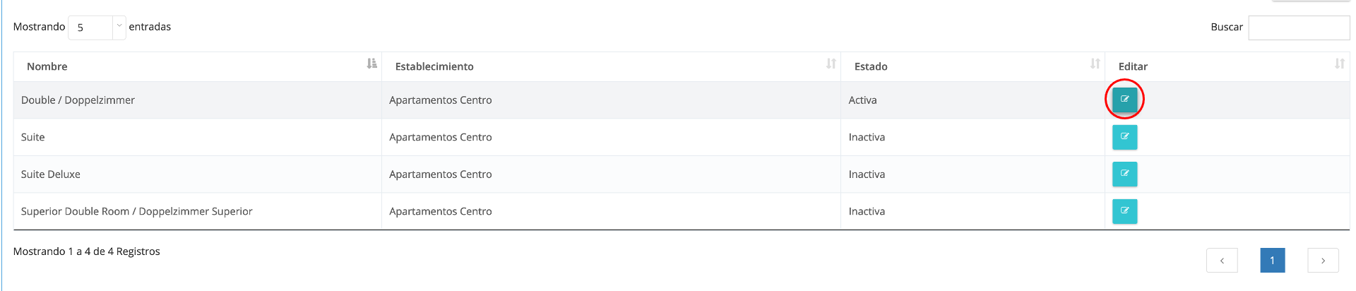 Localizamos el apartamento al que queremos añadir la cama adicional y pulsamos el botón "Editar" en la tabla: