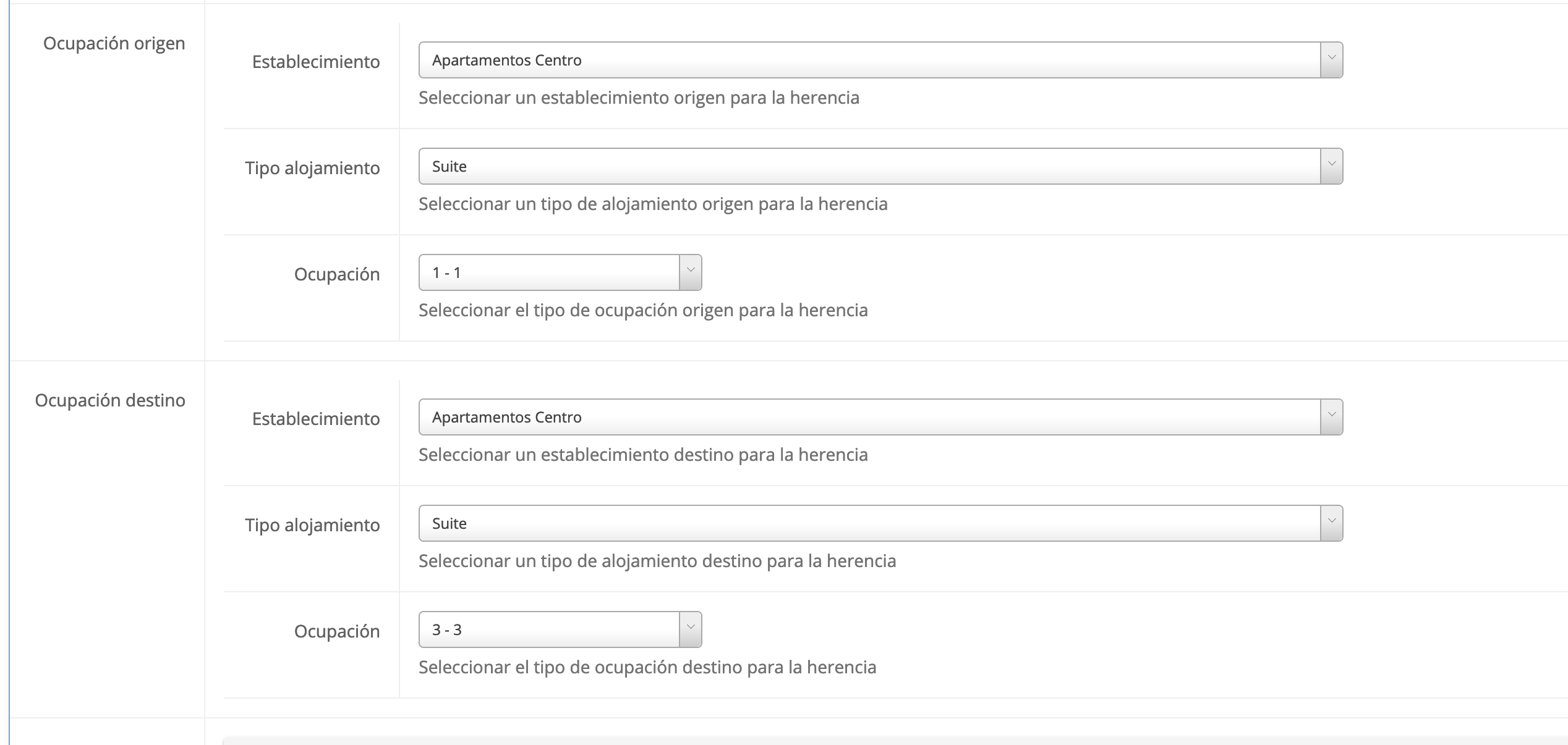 Para crear la nueva, en la parte de abajo de la tabla, tenemos dos Campos, Ocupación origen (será la ocupación base de la que queremos heredar el nuevo precio que asignemos) y la Ocupación destino (en el caso del ejemplo, la nueva ocupación que hemos creado para nuestra cama adicional):