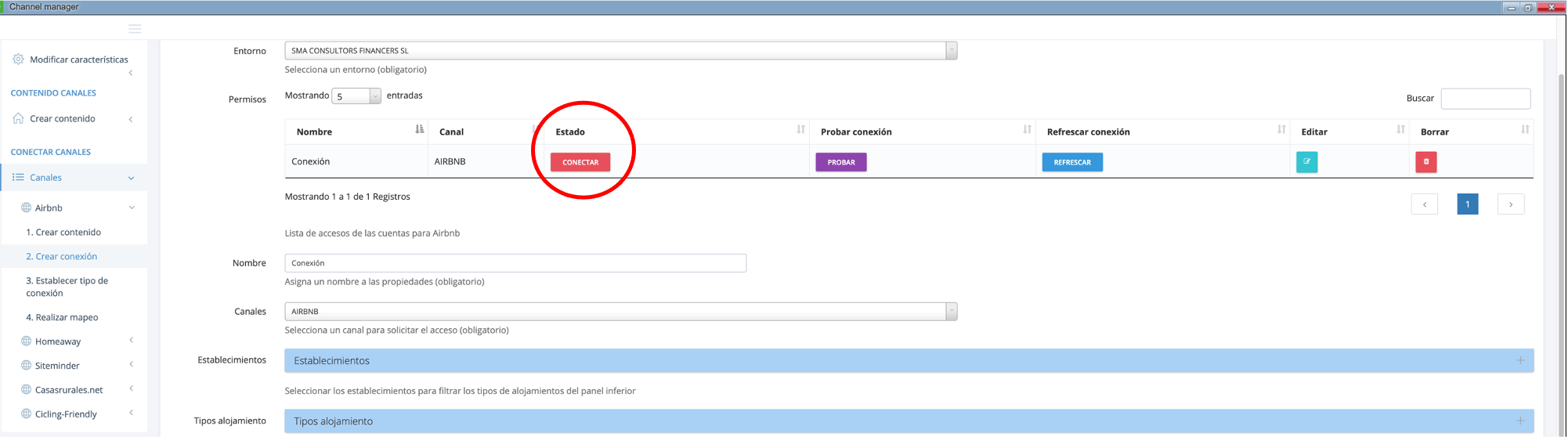 4. Una vez en Crear conexión, veréis que ya está creada la preconexión con airbnb. Pulsáis el botón rojo Conectar: