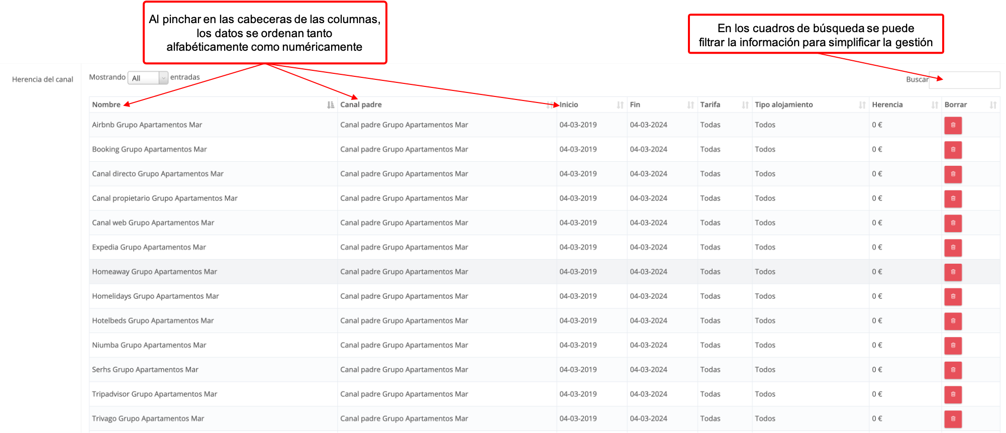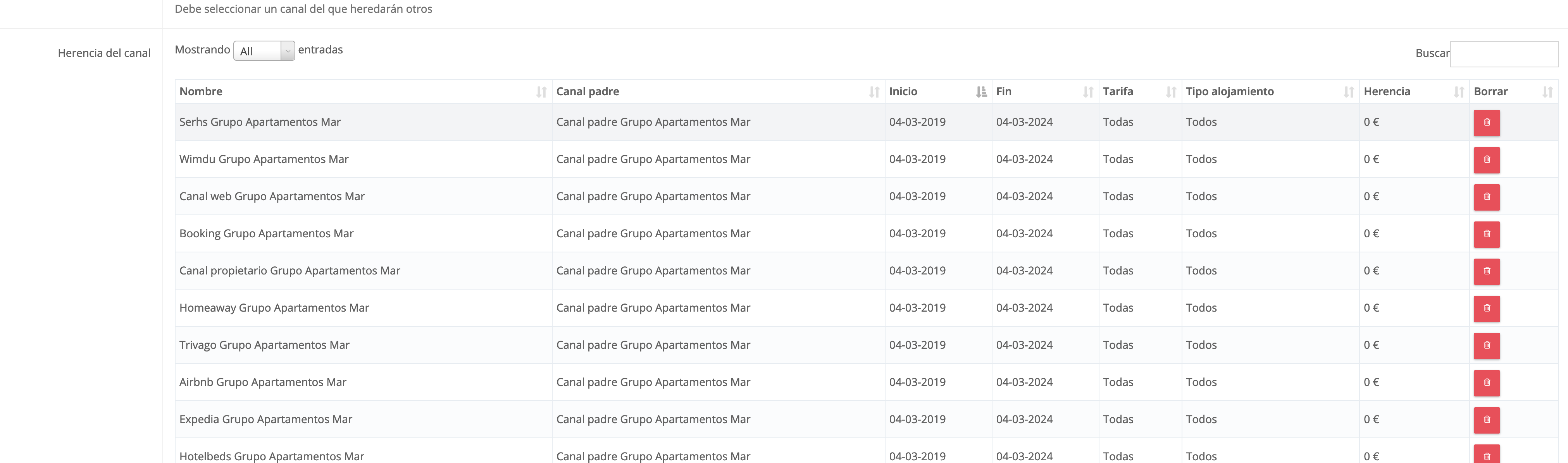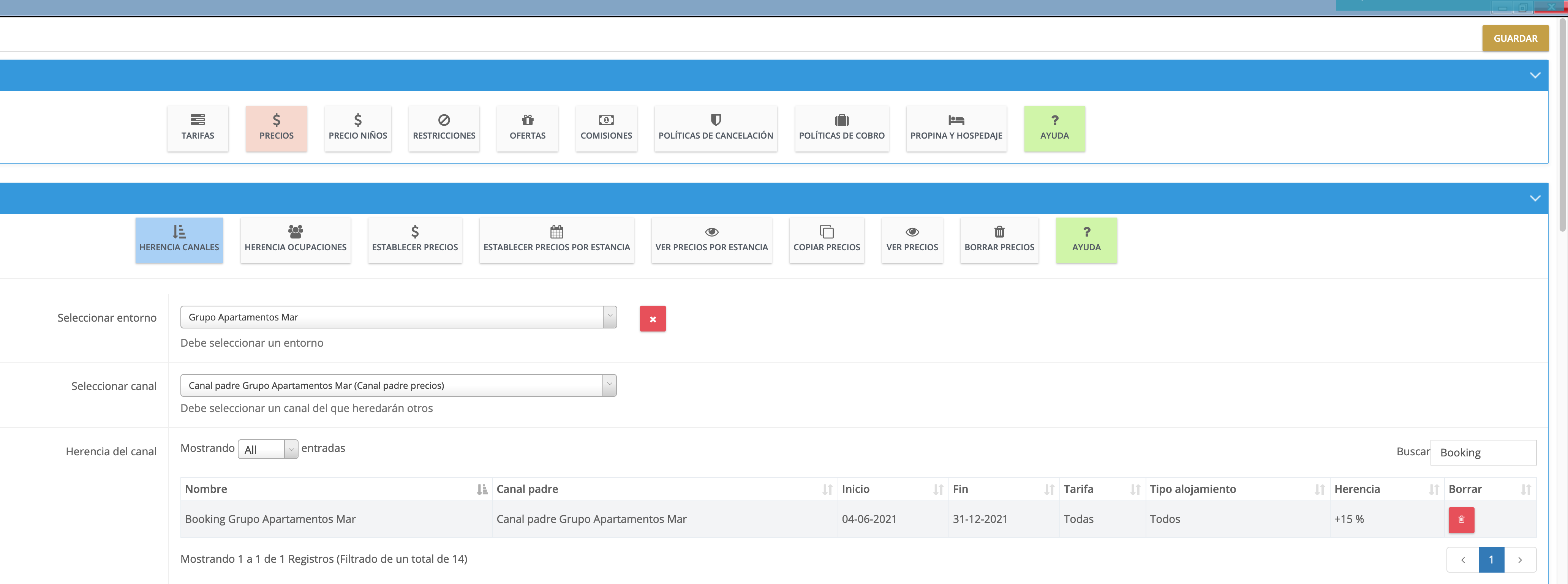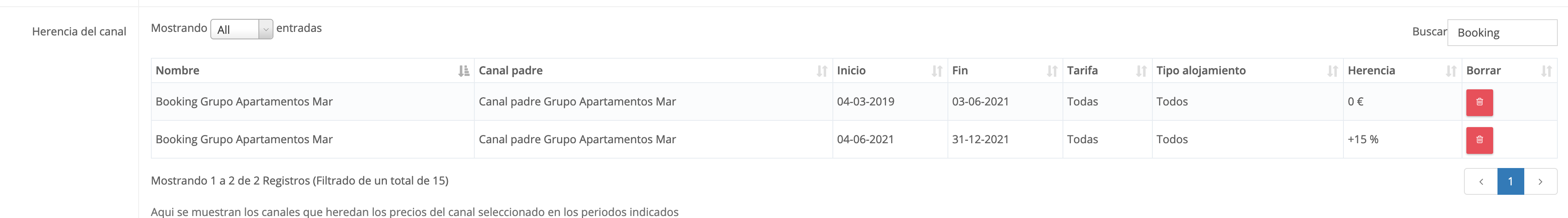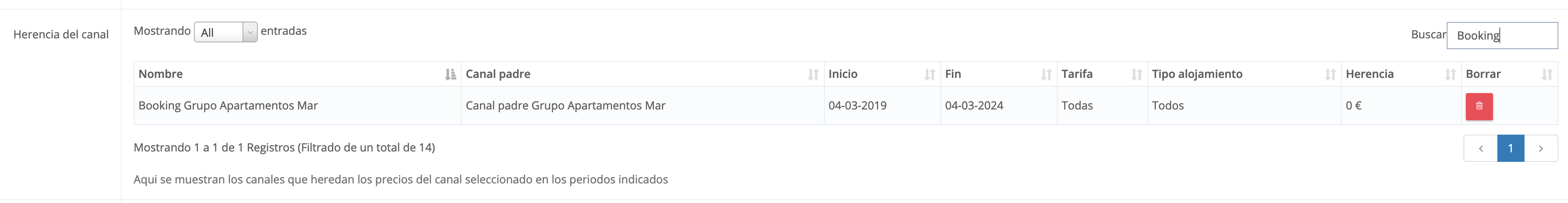 En este caso, en el cuadro de búsqueda vamos a poner Booking para sólo ver las herencias creadas para dicho canal. En este momento sólo estaría creada una única herencia a 0€: