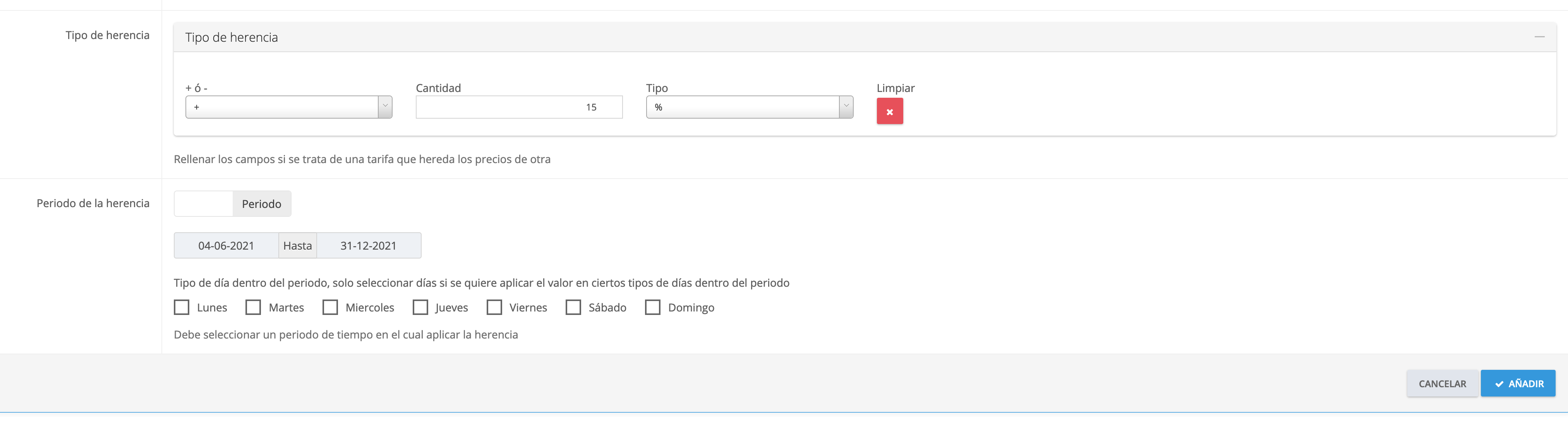 Elegimos el período donde queremos aplicar la herencia y, si quisiéramos, podríamos sólo aplicarla a los días que quisiéramos entre semana.