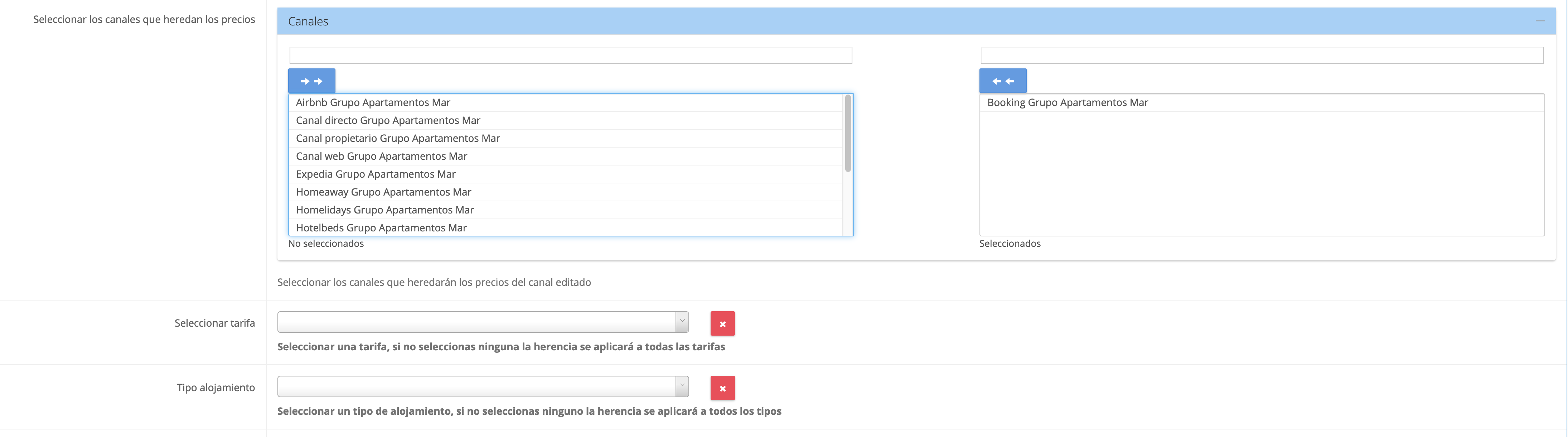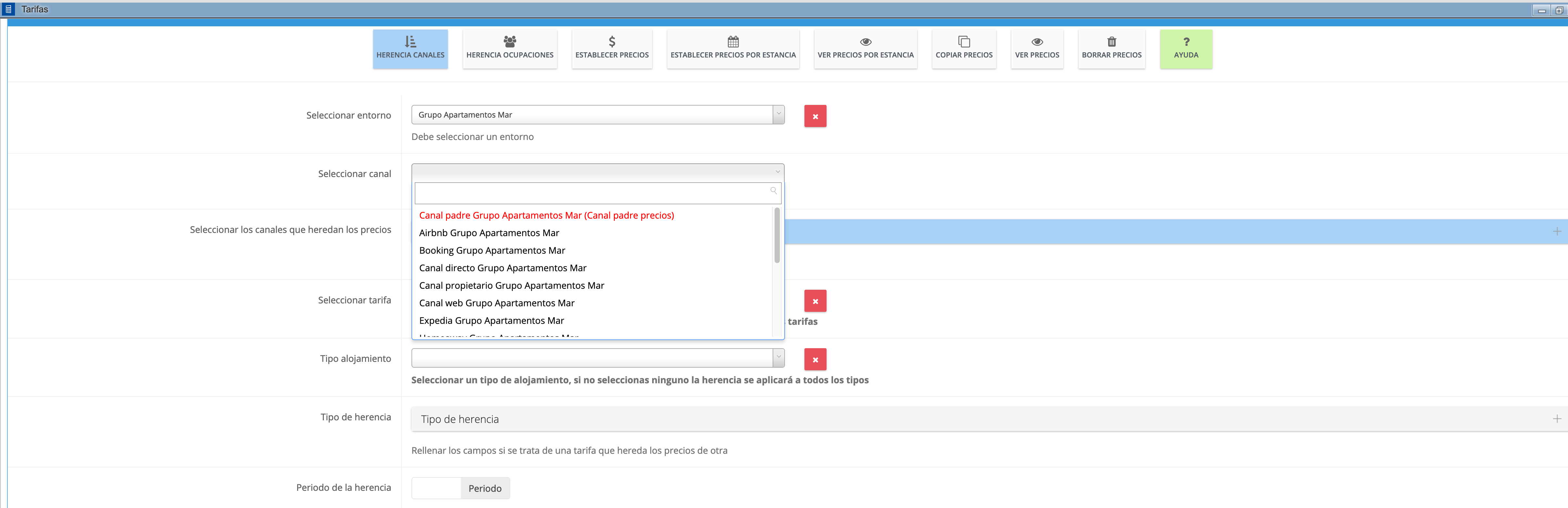 4. En las opciones desplegadas debajo de la tabla elegimos en canal para el que vamos a crear la herencia, en este caso, para Booking:
