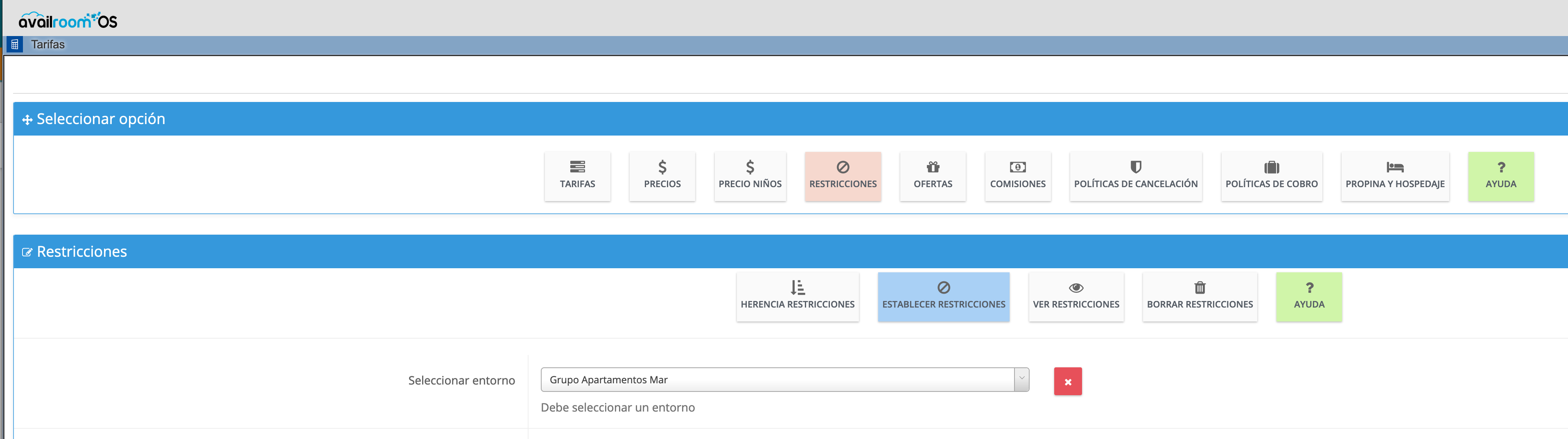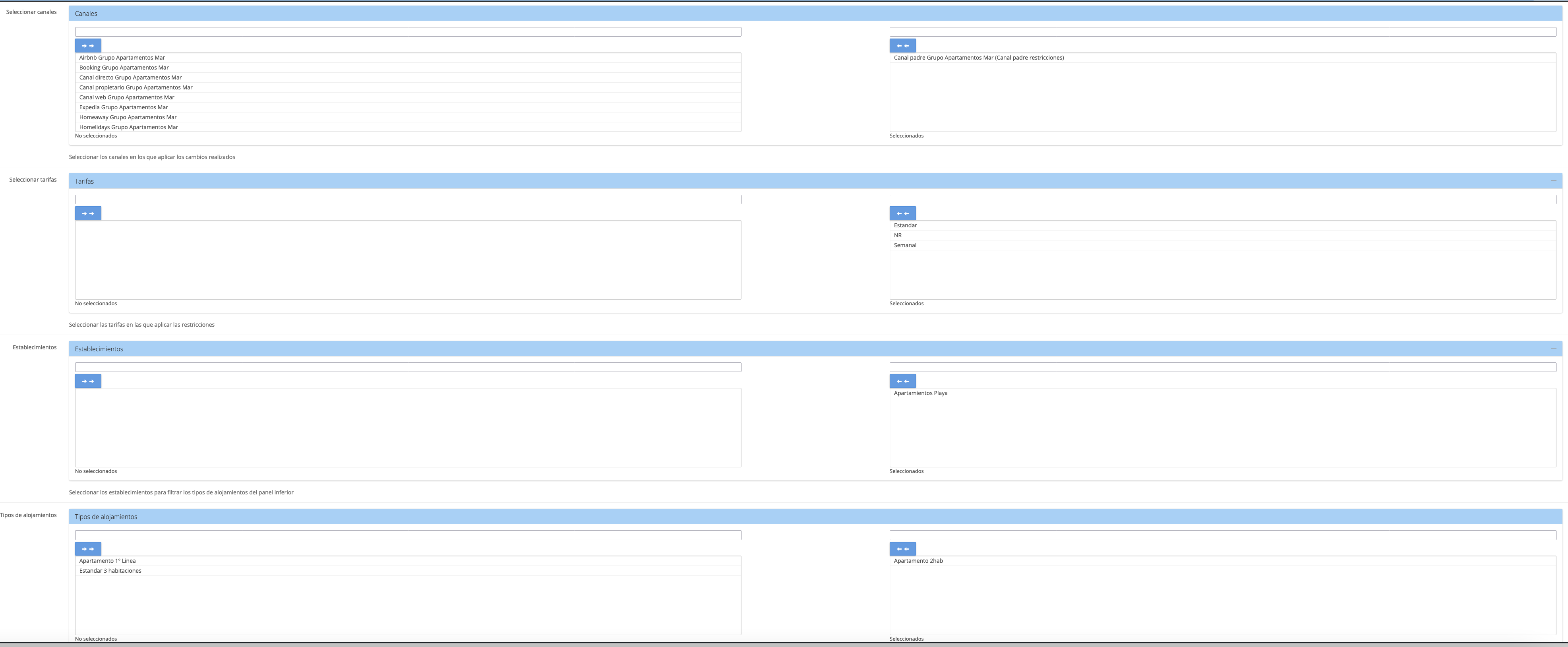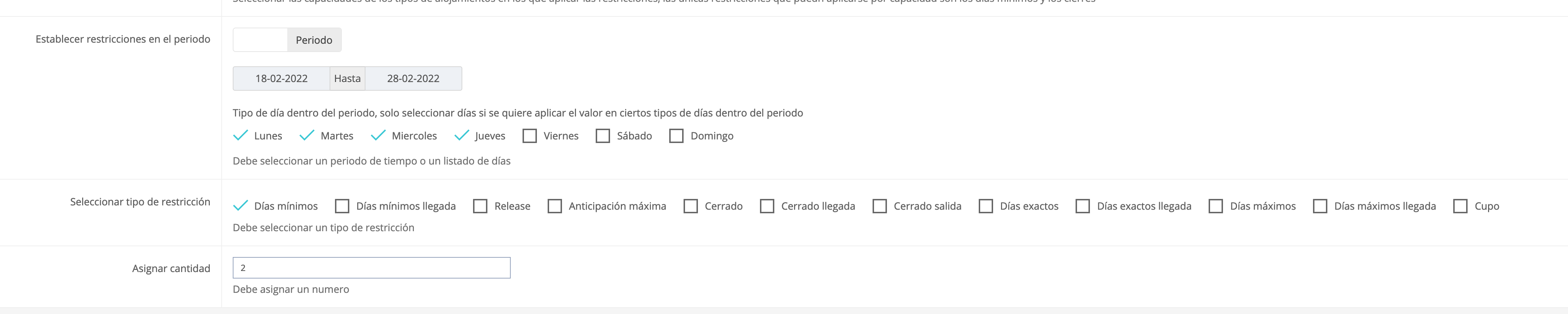 Como sucede en otros menús del PMS, se pueden seleccionar los días de la semana donde queremos aplicar nuestra restricción dentro del período, así como el tipo de restricción que queremos crear: